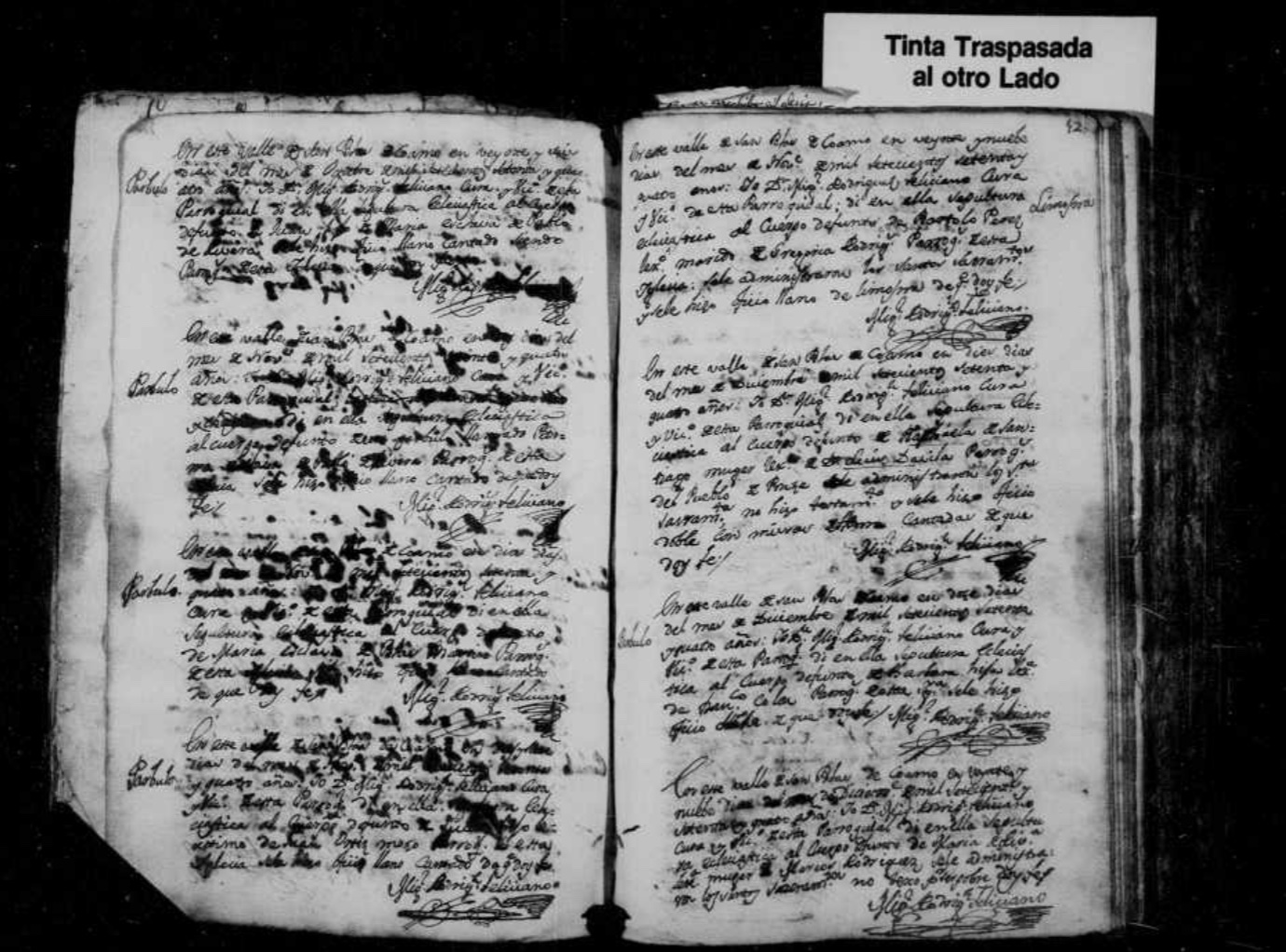 | En este valle de San Blas de Coamo en ___ dias del mes de ___ de mil setecientos setenta y ___ años. Yo ___ cura rector y vicario [o interino] de esta parroquia [o de otra parroquia] di en ella sepultura eclesiástica al cuerpo difunto de ___ legitimo(a)* [hijo(a) o esposo(a)] de ___ y ___** de esta Parroquia***. Se hizo oficio [describe que celebración se hizo en la iglesia]. que doy fe [firma del cura]. |
